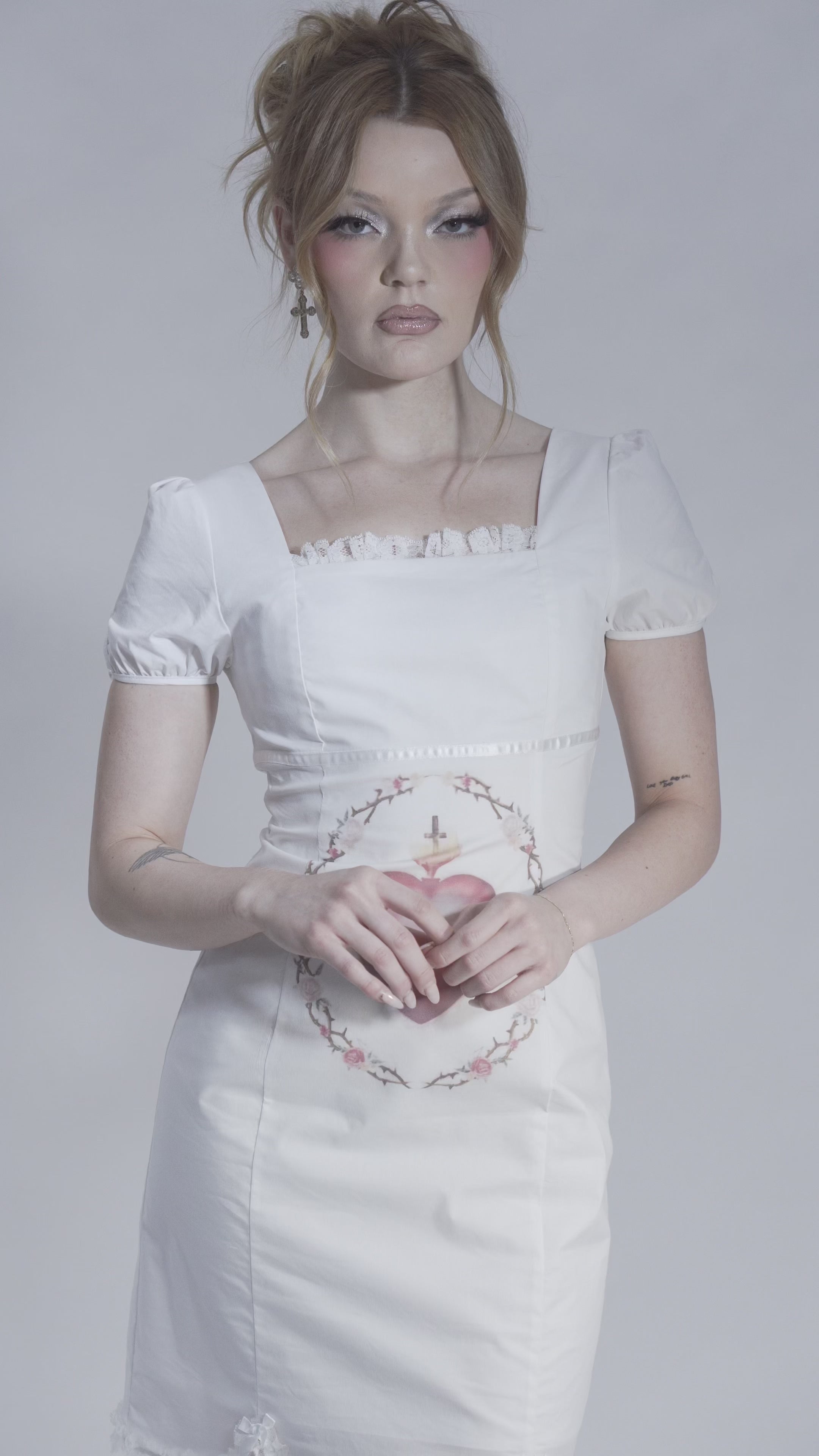 The Dove Dress - Crafted from buttery soft white cotton, featuring Moth Apparel's sacral heart graphic print, this mini dress is the ideal choice for your outings. Step into a touch of classical Italian charm, and become the main character of your own narrative this summer.