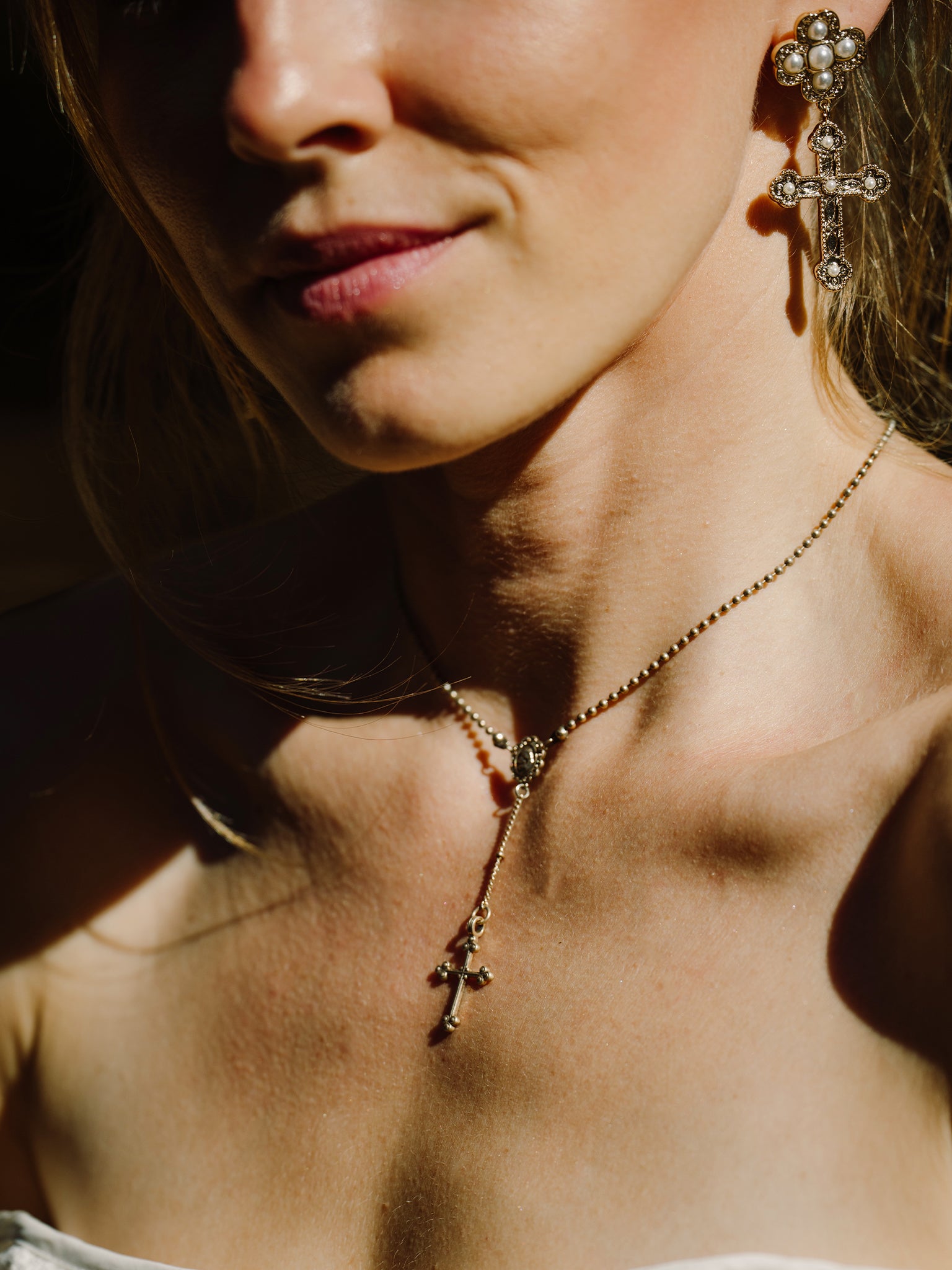 This now mini rosary Necklace boasts a timeless and elegant design that allows its wearers to carry a classic item of beauty with them wherever they go. Crafted from a rich 14K gold and silver plating finish, our necklace is inspired by vintage antiques and is fully adjustable for versatility and comfort. A symbol of grace and fashion, this necklace is a must-have for luxury lovers.