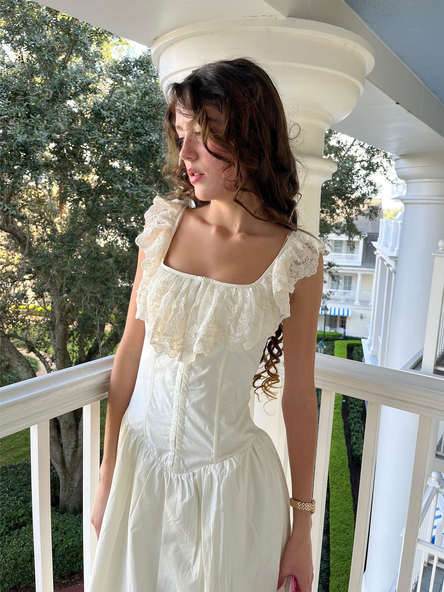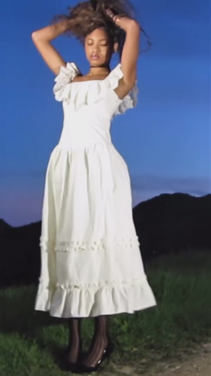 The Maiden Dress channels the restrained drama of Victorian fashion through a modern, sculptural lens. Made from structured cream cotton with a soft, matte finish, it features a corset-inspired bodice, lace square neckline, and an asymmetrical skirt trimmed with bold, architectural flounces. Subtle volume and exposed seaming evoke antique underpinnings—interpreted here for a woman who dresses with intent, not sentimentality. This is modern romance, distilled.